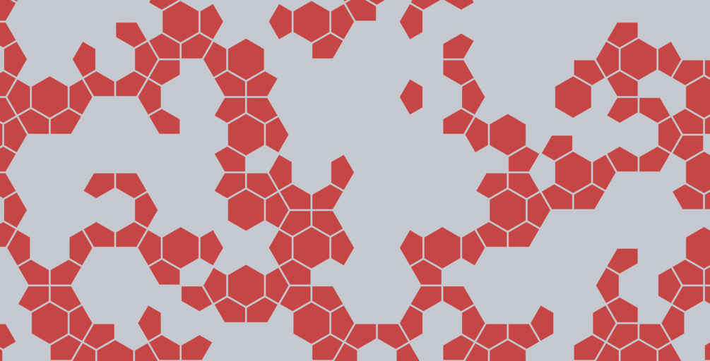The .blend file comprises a simple pattern composed of hexagons and pentagons, which is then arrayed across the plane/surface on a hexagonal grid. Individual polygons are randomly assigned one of two colours (or one of 5 colours - with a tiny, and hopefully obvious, change to the material setup), with smaller areas also being of uniform colour. A slider controls the probability of a polygon being one colour or another.
